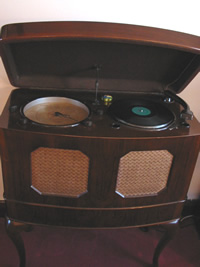 Slightly unusual design. Radio section is straight forward, but the cabinet and dial definitely hark back to shipping days. The dial resembles a ships’ engine telegraph. Nice touch being that the scale is illuminated in different colours depending on waveband selected. When gram is selected, the lamp in the cabinet lid comes on so you can see where to put the record, should you be performing in the dark. Two loudspeakers are fitted, one being for treble, for what there is of it.