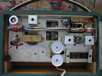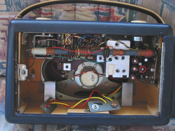 The later sets being solid state used the more traditional battery supply. 2 X PP9s. Sometimes these were wired in series, other times, the supply was split and drove different parts of the set. A good size loudspeaker was used and with plenty of power from the germanium output transistors, these portables put many big sets to shame.